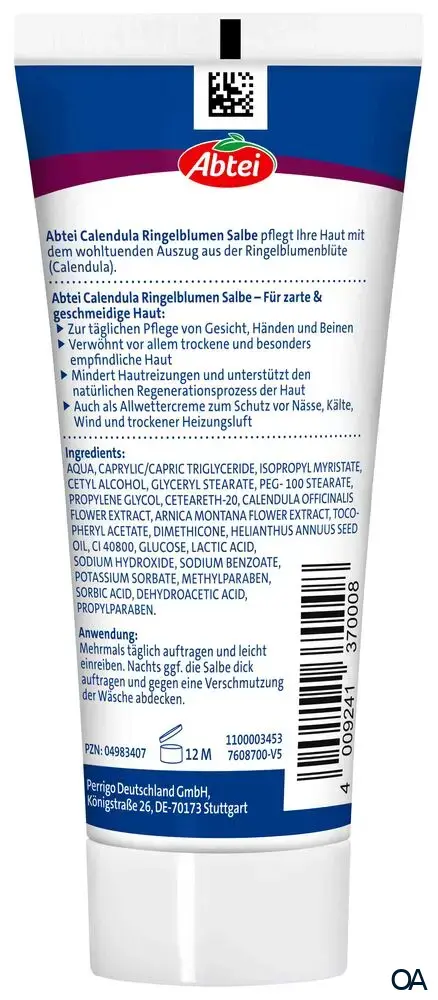 Abtei Calendula Ringelblumen Salbe pflegt trockene und empfindliche Haut mit natürlichen Inhaltsstoffen. Die reichhaltige Formel mit Ringelblume, Arnika und Vitamin E beruhigt und regeneriert die Haut. Ideal für die tägliche Pflege.Abtei Calendula Ringelblumen Salbe pflegt trockene und empfindliche Haut mit natürlichen Inhaltsstoffen. Die reichhaltige Formel mit Ringelblume, Arnika und Vitamin E beruhigt und regeneriert die Haut. Ideal für die tägliche Pflege.