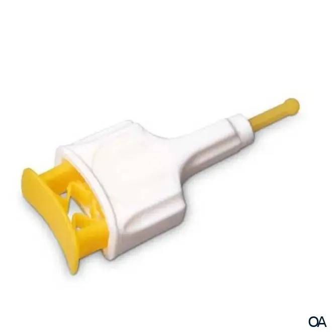 - Stechhilfe fest auf die Einstichstelle setzen und den Auslöseknopf drücken