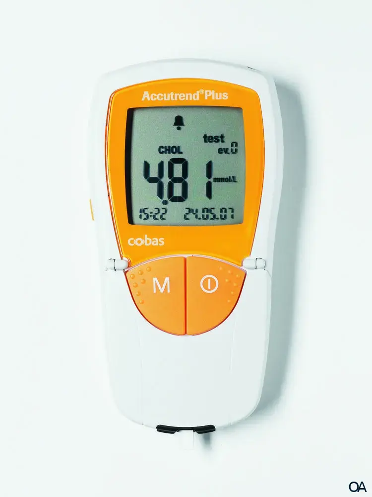 Accutrend Plus System zur schnellen und einfachen Bestimmung kardiovaskulärer Risikofaktoren. Bequeme Bestimmung von Cholesterin, Triglyzeriden, Glukose und Laktat mit bewährter Teststreifen-Technologie aus Kapillarblut.