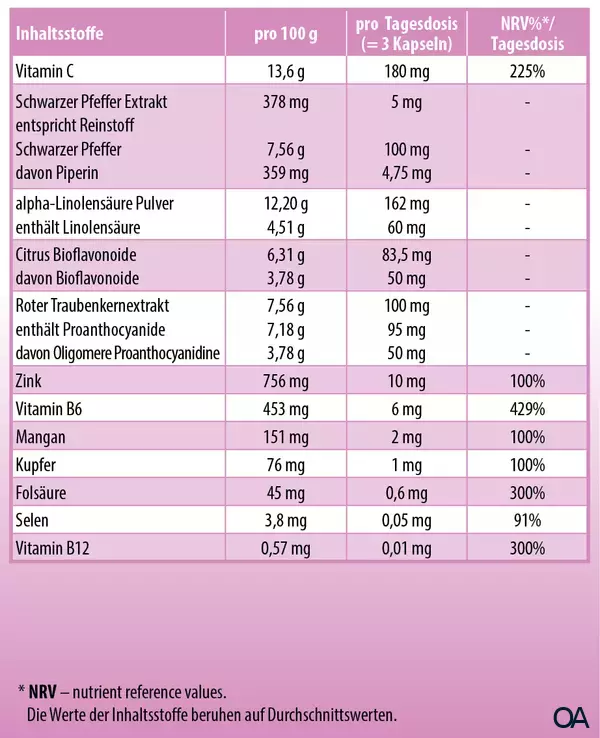 Erbsenfasern, Kapselhülle Hydroxypropylmethylcellulose, Vitamin C, alpha-Linolensäure Pulver (Leinsamen), Roter Traubenkernextrakt, Citrus Bioflavonoide, Zinkgluconat, Maltodextrin, Mangangluconat, Mittelkettige Triglyceride aus Pflanzenöl, Vitamin B6, Kupfer-II-gluconat, Schwarzer Pfeffer Extrakt, Farbstoff Chlorophyllin-Kupfer-Komplex, Folsäure, Natriumselenat, Vitamin B12