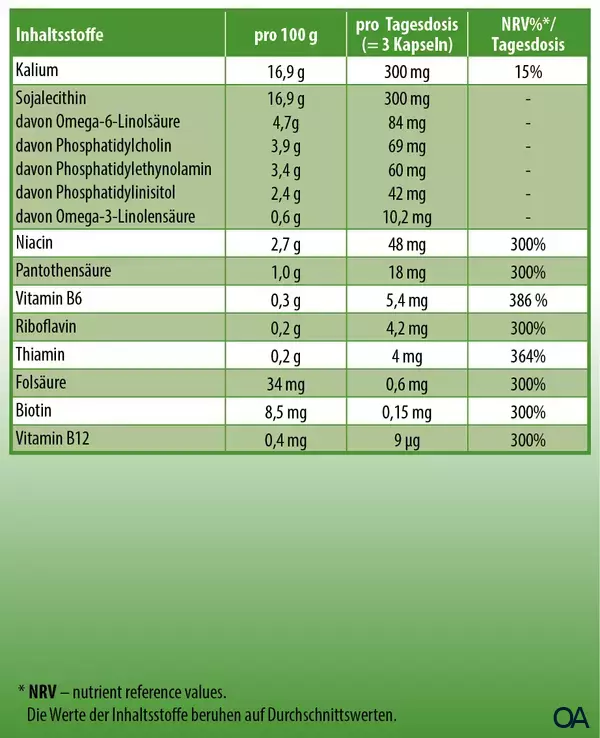 Kaliumhydrogenphosphat, Erbsenfasern, Sojalecithin, Kapselhülle Hydroxypropylmethylcellulose, Maltodextrin, Niacin, Mittelkettige Triglyceride aus Pflanzenöl, Pantothensäure, Vitamin B6, Thiamin, Riboflavin, Farbstoff Chlorophyllin-Kupfer-Komplex, Folsäure, Biotin, Vitamin B12
