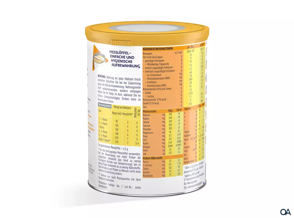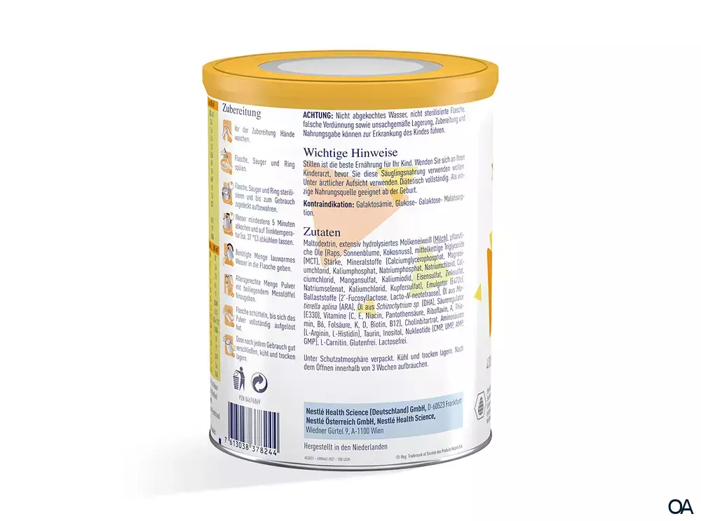 Maltodextrin, extensiv hydrolysiertes Molkeneiweiß (Milch), pflanzliche Öle (Raps, Sonnenblume, Kokosnuss), mittelkettige Triglyceride (MCT), Stärke, Mineralstoffe (Calciumglycerophosphat, Magnesiumchlorid, Kaliumphosphat, Natriumphosphat, Natriumchlorid, Calciumchlorid, Mangansulfat, Kaliumiodid, Eisensulfat, Zinksulfat, Natriumselenat, Kaliumchlorid, Kupfersulfat), Emulgator (E472c), Ballaststoffe (2’-Fucosyllactose, Lacto-N-neotetraose), Öl aus Mortierella aplina (ARA), Öl aus Schizochytrium sp. (DHA), Säureregulator (E330), Vitamine (C, E, Niacin, Pantothensäure, Riboflavin, A, Thiamin, B6, Folsäure, K, D, Biotin, B12), Cholinbitartrat, Aminosäuren (L-Arginin, L-Histidin), Taurin, Inositol, Nukleotide (CMP, UMP, AMP, GMP), L-Carnitin. Glutenfrei. Lactosefrei. Allergene: Milch