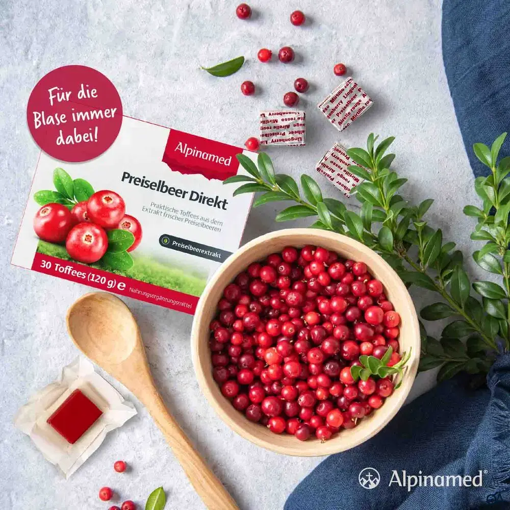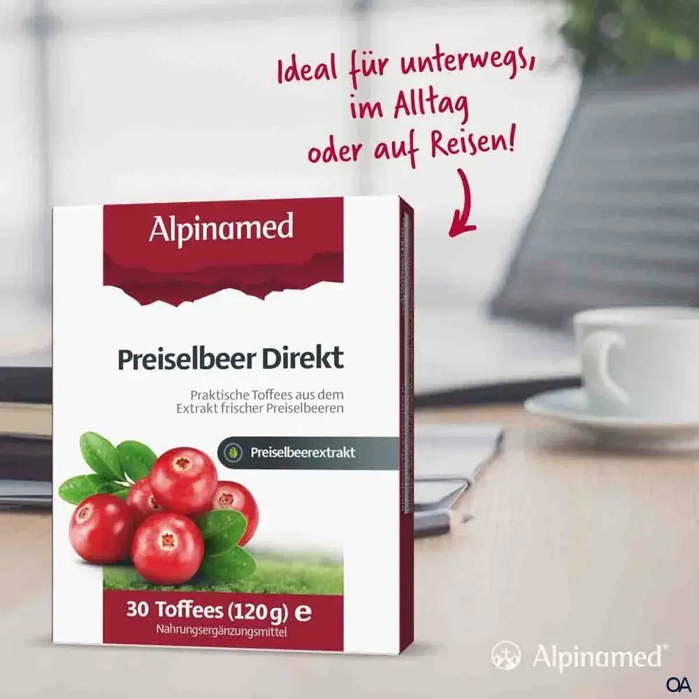Unterstützung gegen das lästige Leiden gibt es aus der Apotheke in Form von Alpinamed® Preiselbeer Direkt mit 100 % Preiselbeer-Extrakt. Praktische Kautoffees für ein neues Gefühl von Freiheit im Alltag und auf Reisen.