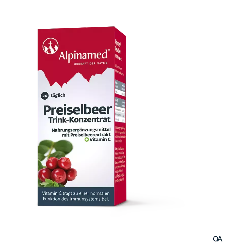 Das Alpinamed® Preiselbeer Trink-Konzentrat ist ein Nahrungsergänzungsmittel mit Preiselbeerextrakt und Vitamin C, zur Unterstützung der normalen Funktion von Immunsystem und Blase.Das Alpinamed® Preiselbeer Trink-Konzentrat ist ein Nahrungsergänzungsmittel mit Preiselbeerextrakt und Vitamin C, zur Unterstützung der normalen Funktion von Immunsystem und Blase.