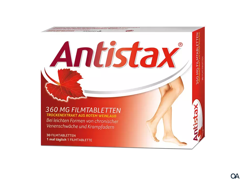 Antistax 360 mg - Filmtabletten sind ein pflanzliches Arzneimittel, das einen Trockenextrakt aus rotem Weinlaub enthält. Die aus Weinlaub gewonnenen Flavonoide verbessern die Durchblutung im Bereich sehr kleiner Blutgefäße bei Patienten mit leichten Formen von chronischer Beinvenenschwäche. Antistax 360 mg - Filmtabletten werden angewendet zur Behandlung der Beschwerden bei leichten Formen von chronischer Beinvenenschwäche (z. B. bei Schwellungen der Beine, Krampfadern, Schweregefühl, Schmerzen, Ermüdung, Juckreiz und Spannungsgefühl).