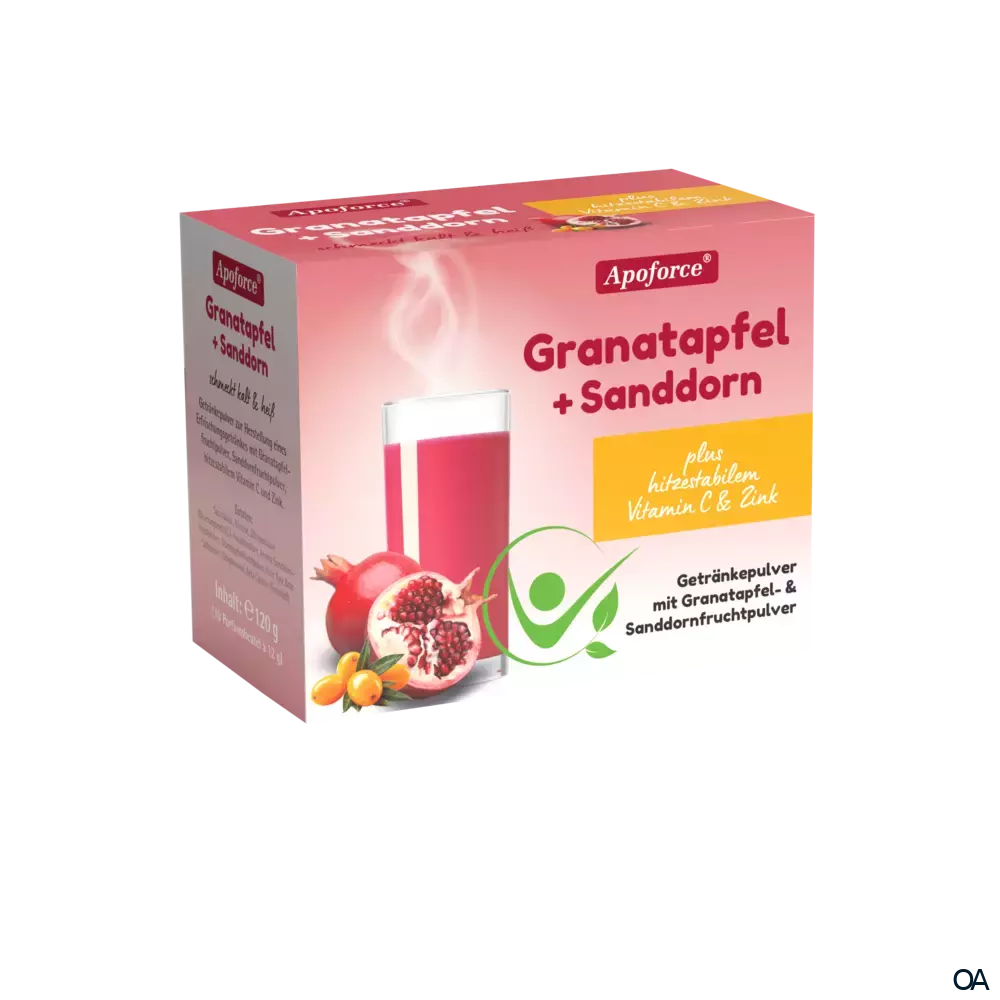 Apoforce® Granatapfel + Sanddorn Getränkepulver zur Herstellung eines Erfrischungsgetränks mit Granatapfelfruchtpulver, Sanddornfruchtpulver, hitzestabilem Vitamin C und Zink.