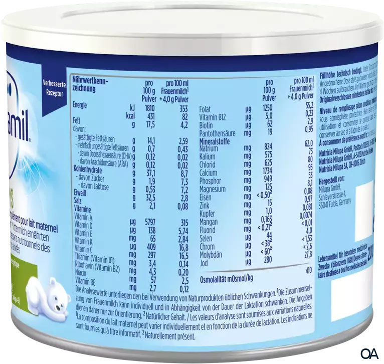 - Nährwerte pro 100g Pulver / Pro 100ml Frauenmilch¹ / Pro 100 ml Frauenmilch¹ + 4,4 g Pulver: Energie kJ 1810 / 353 kcal, 431 / 82, Fett 17,5 / 4,2 g davon: - gesättigte Fettsäuren 14,1 / 2,59 g - mehrfach ungesättigte Fettsäuren 0,7 / 0,43 g -- davon Docosahexaensäure (DHA) 0,12 / 0,02 g -- davon Arachidonsäure (ARA) 0,12 / 0,02 g, Kohlenhydrate 37,1 / 8,7 g davon Zucker² 1,9 / 7,3 g - davon Laktose 0,53 / 7,2 g, Eiweiß 32,5 / 2,8 g, Salz 2,1 / 0,08 g, Vitamin A 5797 / 315 µg, Vitamin D 138 / 5,74 µg, Vitamin E 65 / 2.84 mg, Vitamin K 409 / 16,8 µg, Vitamin C 297 / 16,5 mg, Thiamin (Vit. B1) 3,4 / 0,14 mg, Riboflavin (Vit. B2) 4,3 / 0,20 mg, Niacin 57 / 2,5 mg, Vitamin B6 2,7 / 0,12 mg, Folat 1250 / 55,2 µg, Vitamin B12 5,0 / 0,23 µg, Biotin 62 / 2,9 µg, Pantothensäure 19 / 0,95 mg, Natrium 824 / 62 mg, Kalium 575 / 73 mg, Chlorid 625 / 80 mg, Calcium 1734 / 95 mg, Phosphor 949 / 53 mg, Magnesium 125 / 8,1 mg, Eisen³ < 0,5 / 0,08 mg, Zink 15 / 0,97 mg, Kupfer 1,0 / 0,081 mg, Mangan 0,163 / 0,0074 mg, Fluorid³ < 0,21 / < 0,01 mg, Selen 44 / 4,0 µg, Chrom³ < 38 / 1,53 µg, Molybdän³ < 60 / < 2,6 µg, Jod 280 / 27,8 µg. Die Analysewerte unterliegen den bei Verwendung von Naturprodukten üblichen Schwankungen. ¹ Die Angaben zur Zusammensetzung von Frauenmilch dienen zur Orientierung und können individuell schwanken. ² Davon Lactose 0,4 g pro 100 g Pulver. ³ Natürlicher Gehalt. ⁴ Gehalt kann stark variieren.