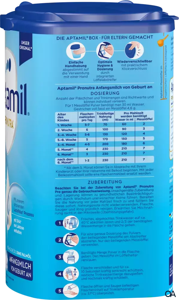 - Zubereitung: Beachte bei der Zubereitung von Aptamil Pre Pronutra genau die Gebrauchsanweisung. Unsachgemäße Zubereitung und Lagerung können zu gesundheitlichen Beeinträchtigungen durch Wachstum unerwünschter Keime führen. Bereite die Nahrung vor jeder Mahlzeit frisch zu und füttere sie sofort. Nahrungsreste nicht wiederverwenden. Flasche, Sauger und Ring gründlich reinigen. Erwärme die Milchnahrung nicht in der Mikrowelle (Überhitzungsgefahr).