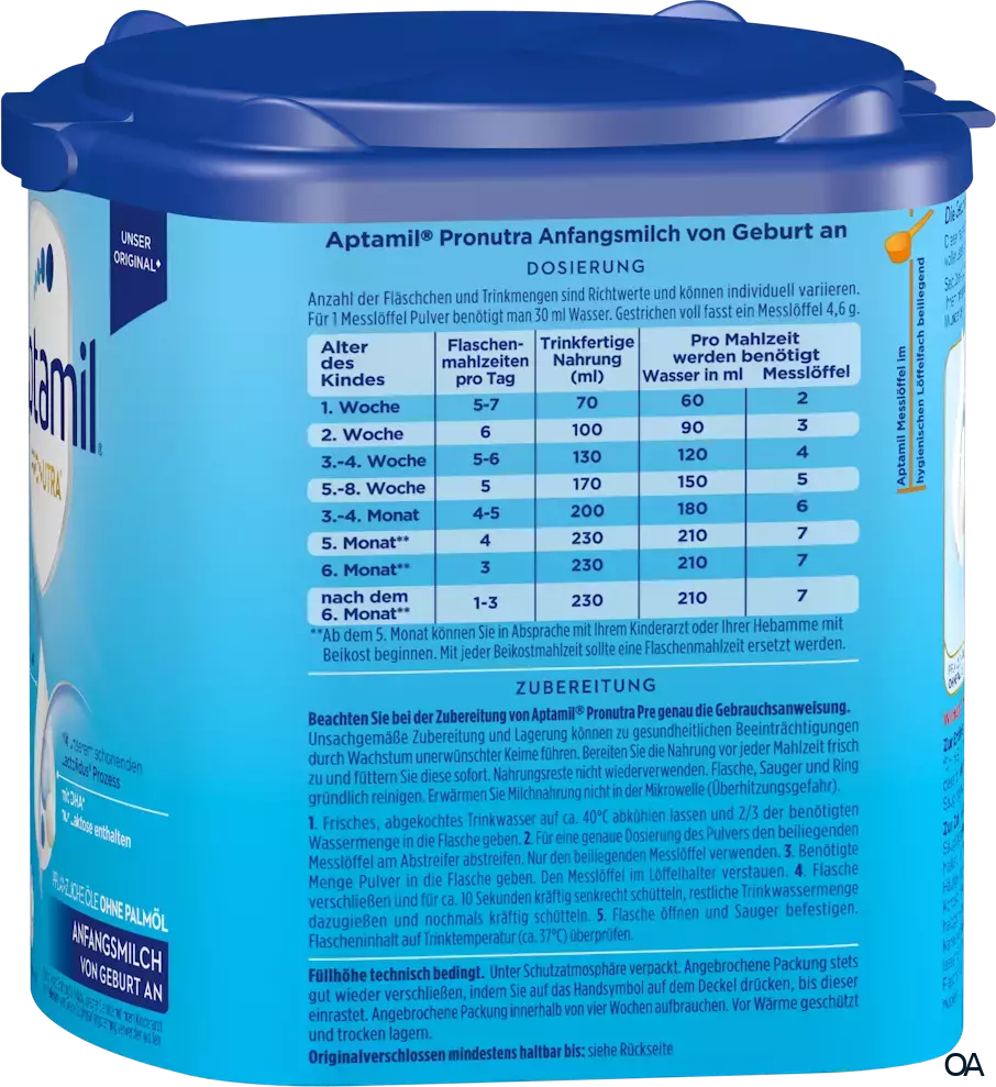 - Zubereitung: Beachte bei der Zubereitung von Aptamil Pre Pronutra genau die Gebrauchsanweisung. Unsachgemäße Zubereitung und Lagerung können zu gesundheitlichen Beeinträchtigungen durch Wachstum unerwünschter Keime führen. Bereite die Nahrung vor jeder Mahlzeit frisch zu und füttere sie sofort. Nahrungsreste nicht wiederverwenden. Flasche, Sauger und Ring gründlich reinigen. Erwärme die Milchnahrung nicht in der Mikrowelle (Überhitzungsgefahr).