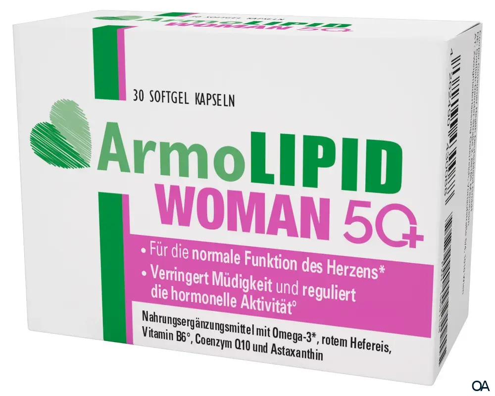 Armolipid Woman 50+ Kapseln sind ein Nahrungsergänzungsmittel mit Omega-3 (EPA und DHA), rotem Hefereis (Monascus purpureus), Folsäure, Vitamin B6, Coenzym Q10 und Astaxanthinreichem Oleoresin aus der Haematococcus pluvialis-Alge.Armolipid Woman 50+ Kapseln sind ein Nahrungsergänzungsmittel mit Omega-3 (EPA und DHA), rotem Hefereis (Monascus purpureus), Folsäure, Vitamin B6, Coenzym Q10 und Astaxanthinreichem Oleoresin aus der Haematococcus pluvialis-Alge.