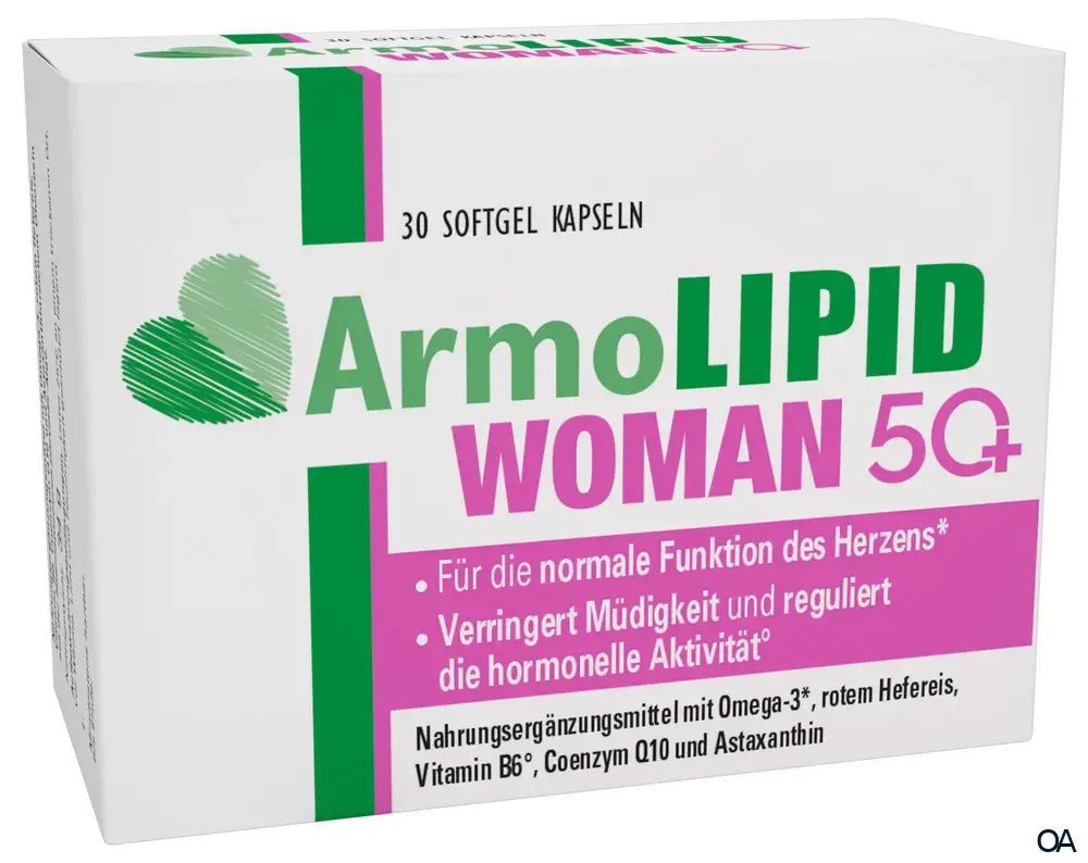 Armolipid Woman 50+ ist ein Nahrungsergänzungsmittel mit Omega-3 (EPA und DHA), rotem Hefereis (Monascus purpureus), Folsäure, Vitamin B6, Coenzym Q10 und Astaxanthinreichem Oleoresin aus der Alge Haematococcus pluvialis. Omega-3 EPA und DHA tragen zur normalen Funktion des Herzens bei*. Vitamin B6 trägt zur Verringerung von Müdigkeit und Ermüdung und zur Regulierung der Hormontätigkeit bei. Folsäure trägt zu einem normalen Homocystein-Stoffwechsel bei. *Die positive Wirkung stellt sich bei einer täglichen Einnahme von 250 mg EPA und DHA ein.