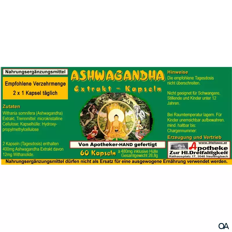 - Zutaten: Withania somnifera (Ashwagandha) Extrakt, Trennmittel: mikrokristalline Cellulose, Kapselhülle: Hydroxypropylmethylcellulose.