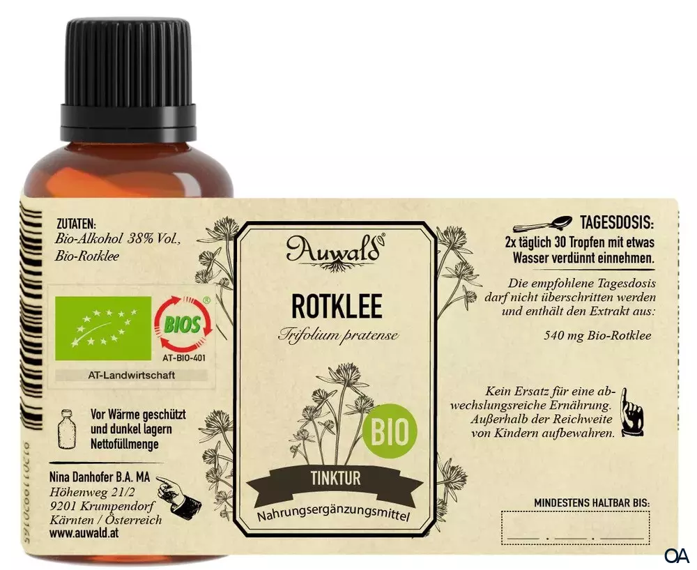 - Zusammensetzung pro Tagesdosis (60 Tropfen): 540 mg Bio-Rotklee.