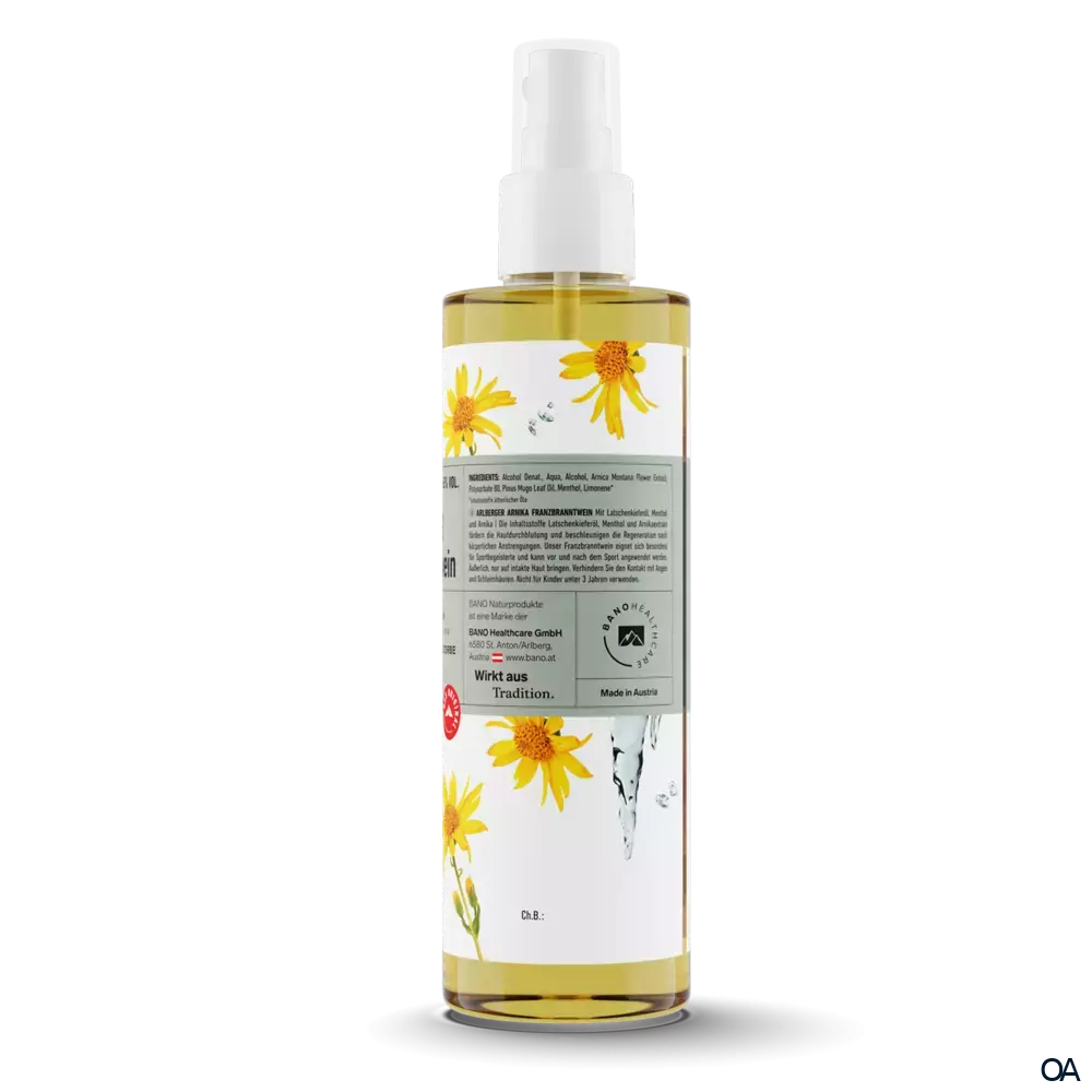 BANO Arlberger Arnika Franzbranntwein ist ideal zur Einreibung für Muskeln mit Latschenkieferöl, Menthol und Arnika. Fördert die Regeneration nach Sport und Verspannungen. Regt die Durchblutung an.BANO Arlberger Arnika Franzbranntwein ist ideal zur Einreibung für Muskeln mit Latschenkieferöl, Menthol und Arnika. Fördert die Regeneration nach Sport und Verspannungen. Regt die Durchblutung an.