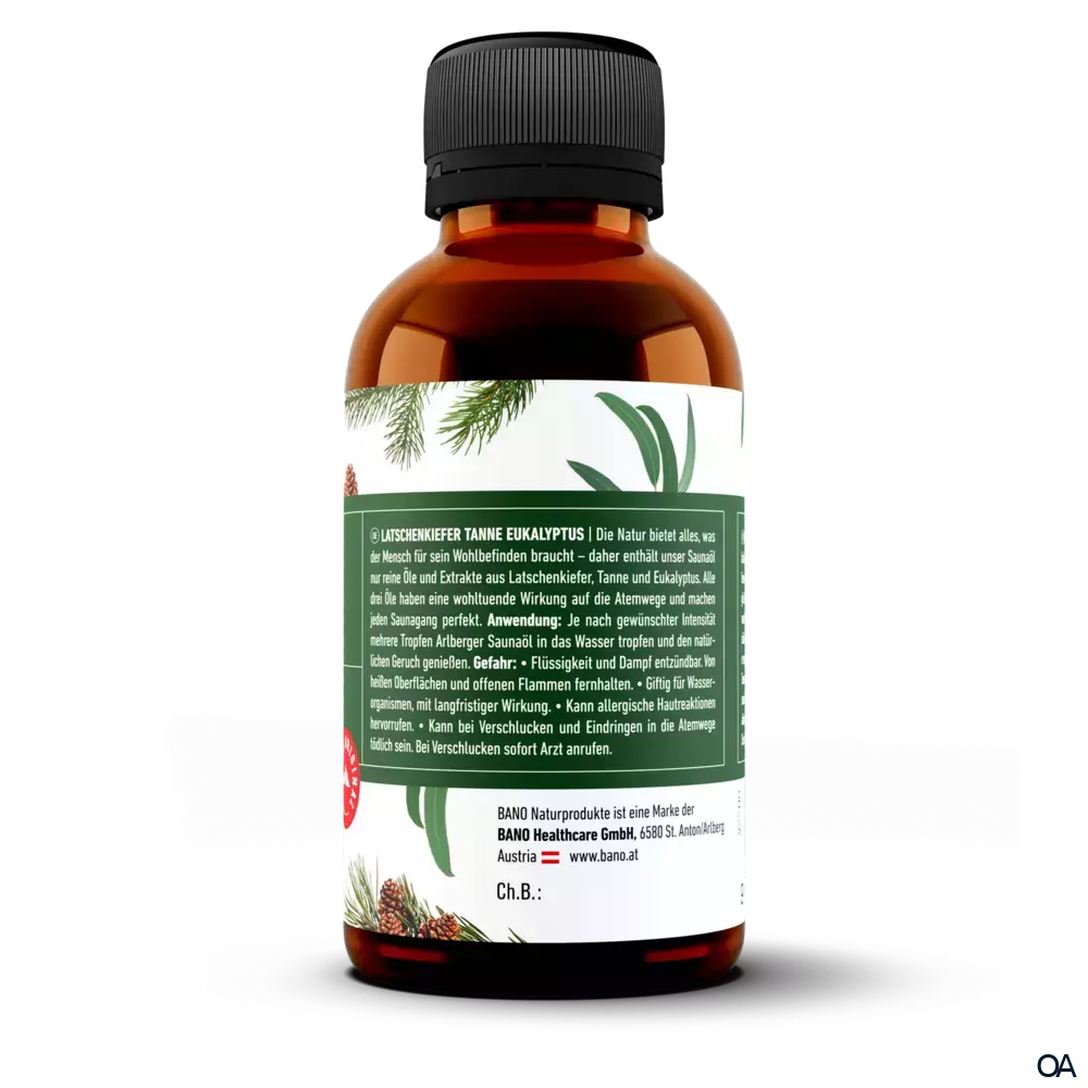 BANO Arlberger Saunaöl hergestellt aus reinen Ölen und Extrakten, mit Latschenkiefer, Tanne und Eukalyptus.BANO Arlberger Saunaöl hergestellt aus reinen Ölen und Extrakten, mit Latschenkiefer, Tanne und Eukalyptus.