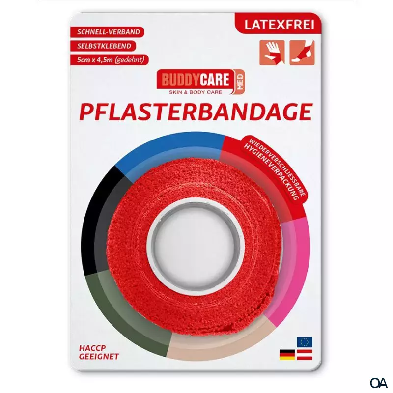 Die BUDDYCARE®MED Pflasterbandagen sind besonders flexibel und angenehm zu tragen. Darüber hinaus sind sie auch perfekt zur Unterstützung von Gelenken geeignet. BUDDYCARE®MED selbsthaftende Pflasterbandagen sind besonders einfach anzuwenden und diese können passgenau per Hand abgerissen werden. Die BUDDYCARE®MED Pflasterbandagen bieten einen sicheren Halt auf der Haut ohne zu verrutschen. Die Pflasterbandagen sind wasserabweisend und bieten selbst bei nasser und schwitzender Haut einen sicheren Halt ohne zu verrutschen.