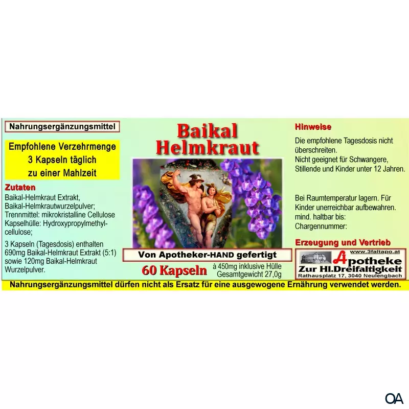 - Zusammensetzung pro Tagesdosis (3 Kapseln): 3570 mg Baikal Helmkrautwurzelpulver.