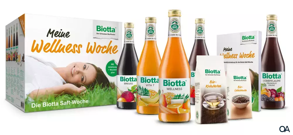 Biotta® Bio Wellness Woche Kur-Paket - 11 naturbelassenen Fruchtsäfte und Gemüsesäfte zum Entschlacken, Ernährungsumstellung oder für eine gesunde Ernährungsweise.Eine schon lang geplante Ernährungsumstellung? Einfach mal zur Ruhe kommen? – Gründe gibt es viele für die Biotta Wellness Woche. Aus welcher Motivation auch immer Sie sich für die Saft-Woche entscheiden, das Wellness Woche-Paket bietet alles in einer handlichen Box.