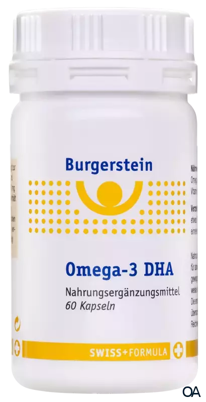 Burgerstein Omega-3 DHA - Die Lieblingsfettsäure Ihres Hirns. Eine ausreichende Versorgung mit DHA trägt zur Erhaltung einer normalen Gehirnfunktion und der optimalen Sehkraft bei (Wirkung ab 250 mg DHA pro Tag).Eine ausreichende Versorgung mit DHA trägt zur Erhaltung einer normalen Gehirnfunktion und der optimalen Sehkraft bei (Wirkung ab 250 mg DHA pro Tag). Burgerstein Omega-3 DHA enthält einen hohen Anteil Omega-3-Fettsäuren, gewonnen aus reinem Fischöl, mit einem hohen Anteil an DHA. Selbstverständlich ist es gut verträglich und kann regelmäßig und langfristig eingenommen werden.