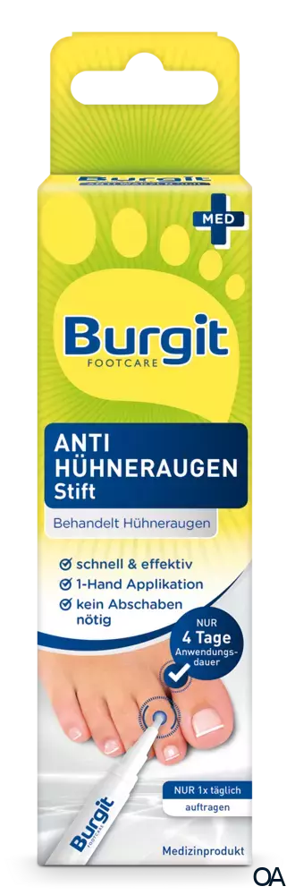 Burgit Footcare Anti Hühneraugen Stift - Der Wirkstoff TCA-Active™ im Gel entfernt das unerwünschte Hühnerauge bzw. die unerwünschte Haut und fördert die Bildung neuer, gesunder Haut.Burgit Anti Hühneraugen Stift - Der Wirkstoff TCA-Active™ im Gel entfernt das unerwünschte Hühnerauge bzw. die unerwünschte Haut und fördert die Bildung neuer, gesunder Haut.