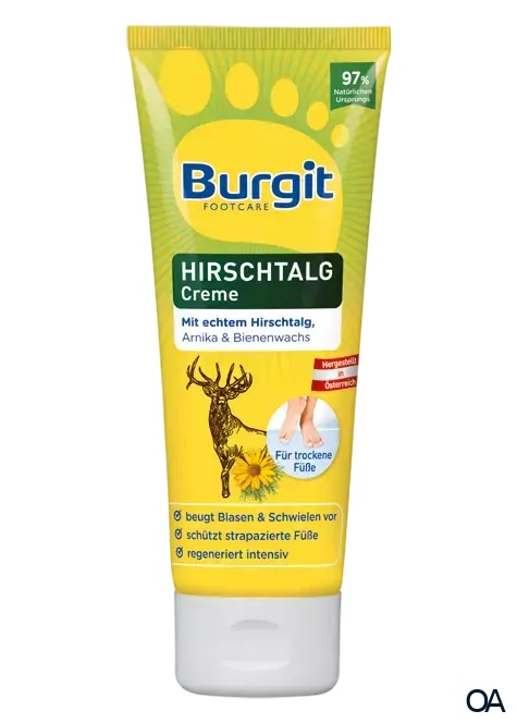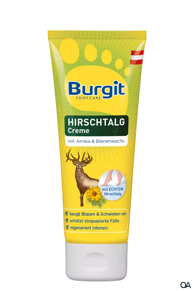 - Morgens und abends Burgit Hirschtalg Pflege Creme auf die strapazierte Haut an Händen und Füßen einmassieren. Auch vorbeugend und bei längerer Bettlägrigkeit geeignet. Besonders nach einem warmen Fußbad mit Burgit Erfrischendes Fußbad zu empfehlen.
