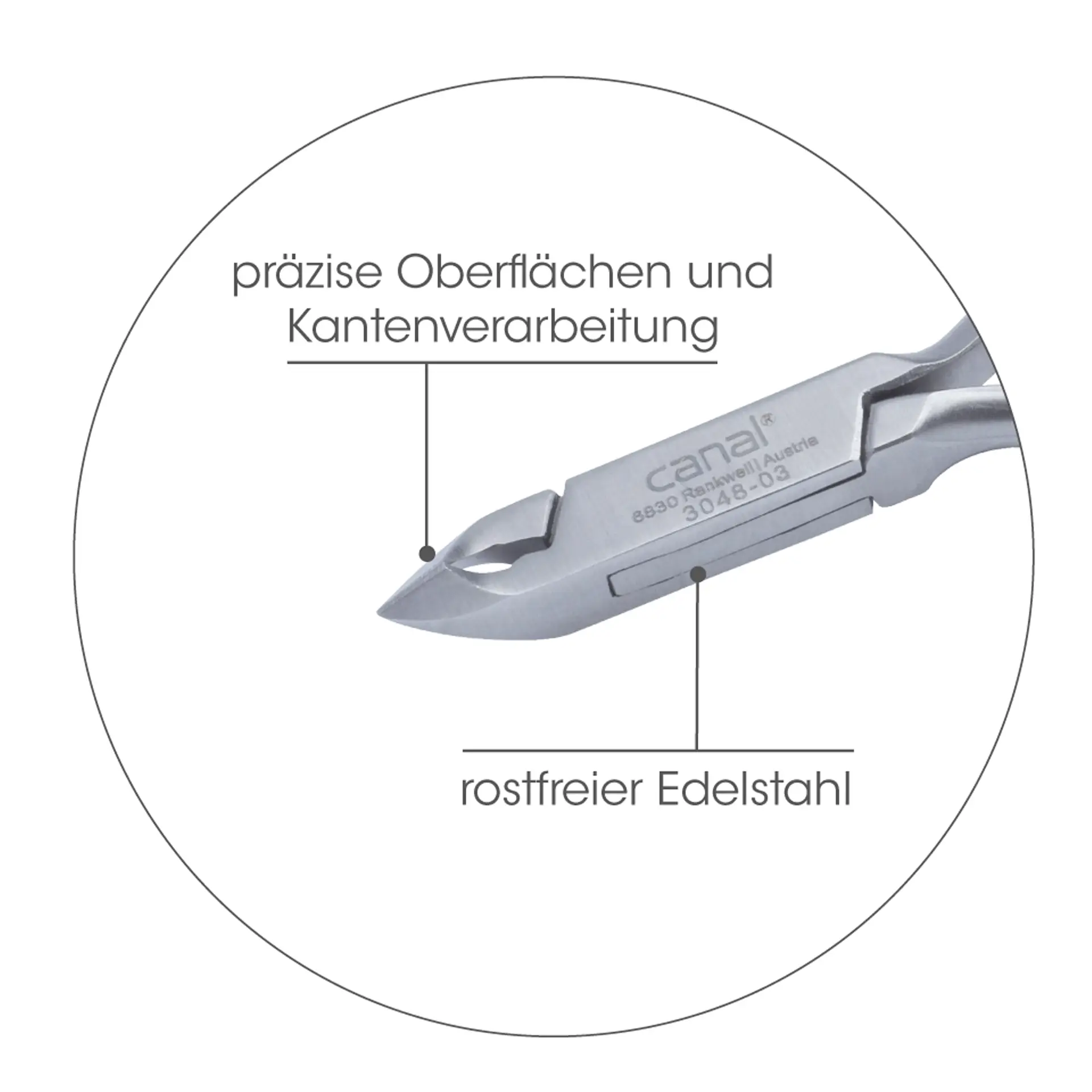 Die Zange ist ohne Schrauben verarbeitet, was für eine hohe Stabilität sorgt. Alle canal Zangen sind nachschleifbar und bieten eine umweltfreundliche, nachhaltige Lösung für Ihre Nagelpflege.