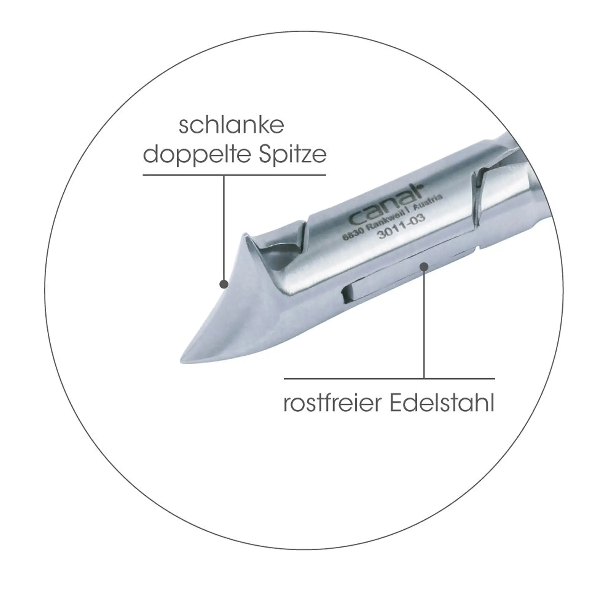 Jede Canal® Zange wird von Hand geschliffen und zeichnet sich durch feinste Spitzen und genau aufeinander abgestimmte Schneidflächen aus. Die runde, dem Nagel angepasste Form sorgt für eine präzise Anwendung, und die Zange ist dank der stabilen, schraubenlosen Verarbeitung besonders langlebig. Alle canal Zangen sind nachschleifbar, was sie umweltfreundlich und nachhaltig macht – für eine garantierte lebenslange Freude an Ihrem Präzisionsinstrument.