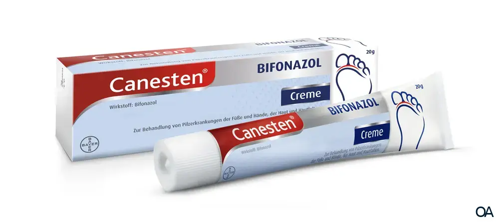 Canesten® Bifonazol Creme - Die hochwirksame Therapie von Fußpilz. Muss nur einmal täglich aufgetragen werden. Hilft gegen Juckreiz und beseitigt lästige Symptome.Canesten Bifonazol - Creme ist ein Breitspektrum – Antimykotikum zur Behandlung von Pilzerkrankungen (Mykosen) der Haut. Pilzerkrankungen können an praktisch jeder Stelle des Körpers auftreten; besonders gefährdet sind Körperstellen, an denen Haut auf Haut liegt, also zwischen den Zehen, in der Leistengegend oder in der Achselhöhle. Bifonazol, der Wirkstoff in Canesten Bifonazol Creme, dringt in die befallenen Hautschichten ein und tötet dort den Pilz ab.