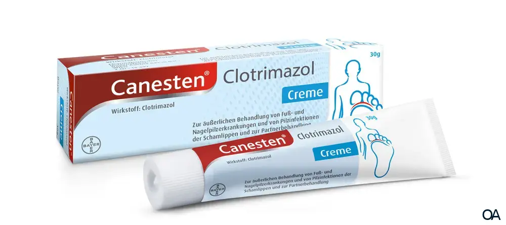 Canesten® Clotrimazol Creme ist ein Arzneimittel zur Behandlung von Pilzerkrankungen (Mykosen) der Haut und Schleimhaut.Canesten Creme ist ein Arzneimittel zur Behandlung von Pilzerkrankungen (Mykosen) der Haut und Schleimhaut. Aufgrund des breiten Wirkspektrums von Clotrimazol wirkt die Creme gegen viele verschiedene Erreger, die beim Menschen Pilzinfektionen der Haut hervorrufen können.