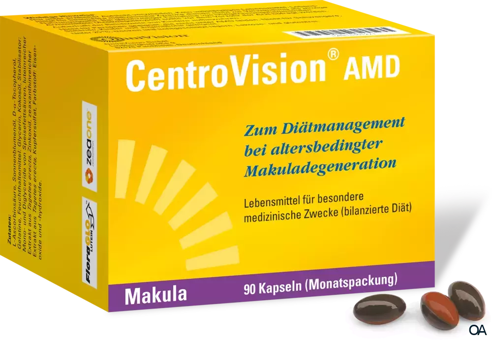 CentroVision® AMD - Ist ein Lebensmittel für besondere medizinische Zwecke zum Diätmanagement bei altersbedingter Makuladegeneration (AMD).CentroVision® AMD enthält eine bilanzierte Stoffkombination aus den wichtigen Vitaminen C und E, den Mineralstoffen Zink und Kupfer sowie den Carotinoiden Lutein und Zeaxanthin. Die Zusammensetzung der Inhaltsstoffe von CentroVision® AMD wurde nach den wissenschaftlichen Erkenntnissen einer groß angelegten Humanstudie sorgfältig abgestimmt und eignet sich damit zum Diätmanagement bei altersbedingter Makuladegeneration im intermediären und fortgeschrittenen Stadium (nach den Kategorien AREDS 3 und 4).