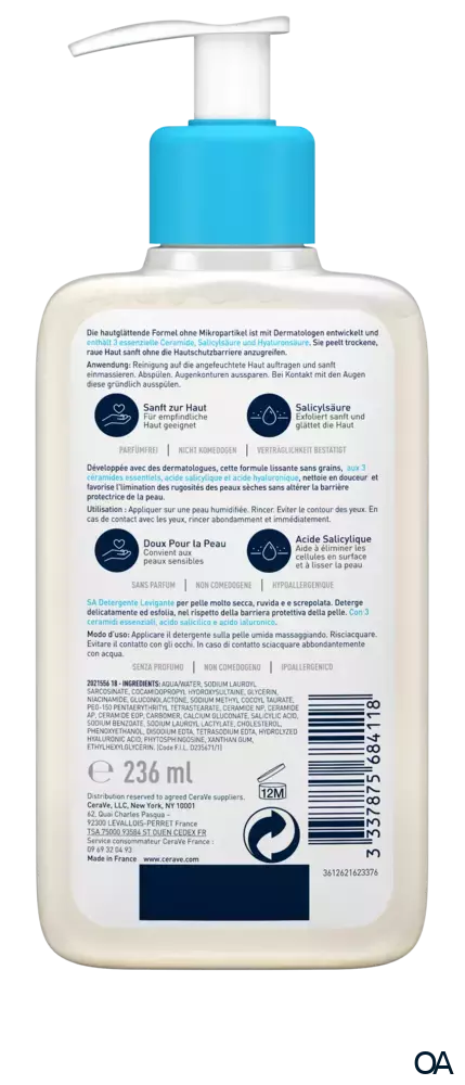 CeraVe SA Glättende Reinigung - Für trockene, raue und unebene Haut, mit 3 essenziellen Ceramiden und Hyaluron. Die Waschlotion für Körper und Gesicht entfernt Schmutz sowie Talg und sorgt für eine glattere Haut mit 3 essenziellen Ceramiden.Die hautglättende Formel ohne Mikropartikel ist mit Dermatologen entwickelt und enthält 3 essenzielle Ceramide, Salicylsäure und Hyaluronsäure. Sie peelt trockene, raue Haut sanft ohne die Hautschutzbarriere anzugreifen. Die SA Glättende Reinigung ist Parfümfrei, nicht komedogen und ist für empfindliche Haut geeignet.