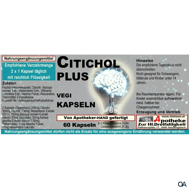 Die Citichol Plus Vegi Kapseln sind ein Nahrungsergänzungsmittel mit Citicolin, die Vorstufe vom Botenstoff Phospatidylcholin, unterstützt die Leistungsfähigkeit der Gehirnzellen!