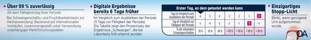 Ergebnisse 6 Tage vor dem Ausbleiben der Periode (5 Tage vor Fälligkeit der Periode). 78 % der Schwangerschaften können 6 Tage vor dem Ausbleiben der Periode erkannt werden, 93 % der Schwangerschaften 5 Tage vor dem Ausbleiben der Periode und 99 % oder mehr 4 Tage vor dem Ausbleiben der Periode.