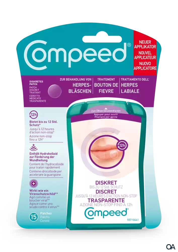 - Das Compeed® Herpesbläschen Patch wirkt, indem es den natürlichen Heilungsprozess des Körpers beschleunigt. Seine Hydrokolloid-Technologie mit Aktiv-Gel stellt eine optimale und keimfreie Wundheilungsumgebung bereit und verhindert die Schorfbildung. Das diskrete Herpesbläschen Patch legt sich wie ein Schutzschild auf und um die betroffene Stelle und verhindert die Ausbreitung des Virus.