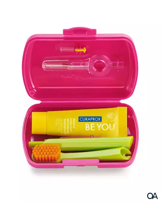 Das Curaprox Reise-Set enthält eine kompakte Reisezahnbürste, 10 ml raffiniert-frische Whitening-Zahnpasta und zwei Interdentalbürsten mit praktischem Halter – perfekte Mundhygiene, wo immer du gerade bist.