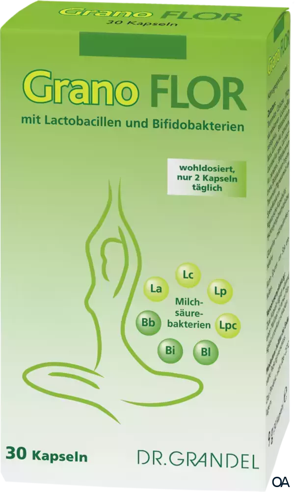 DR. GRANDEL Granoflor Kapseln - Wohldosiertes Nahrungsergänzungsmittel mit Lactobacillen und Bifidobakterien.Granoflor enthält 7 ausgewählte Kulturen von Milchsäurebakterien, die zum allgemeinen Wohlbefinden im Darm beitragen. Jede Kapsel enthält 10 Milliarden (10 x 109) Milchsäurebakterien. Die natürliche Darmflora des Menschen besteht aus rund 400 - 500 verschiedenen Arten von Mikroorganismen, die sich überwiegend im Dickdarm befinden. Das Zusammenspiel dieser Bakterien mit der Darmschleimhaut spielt eine wichtige Rolle für das allgemeine Wohlbefinden.