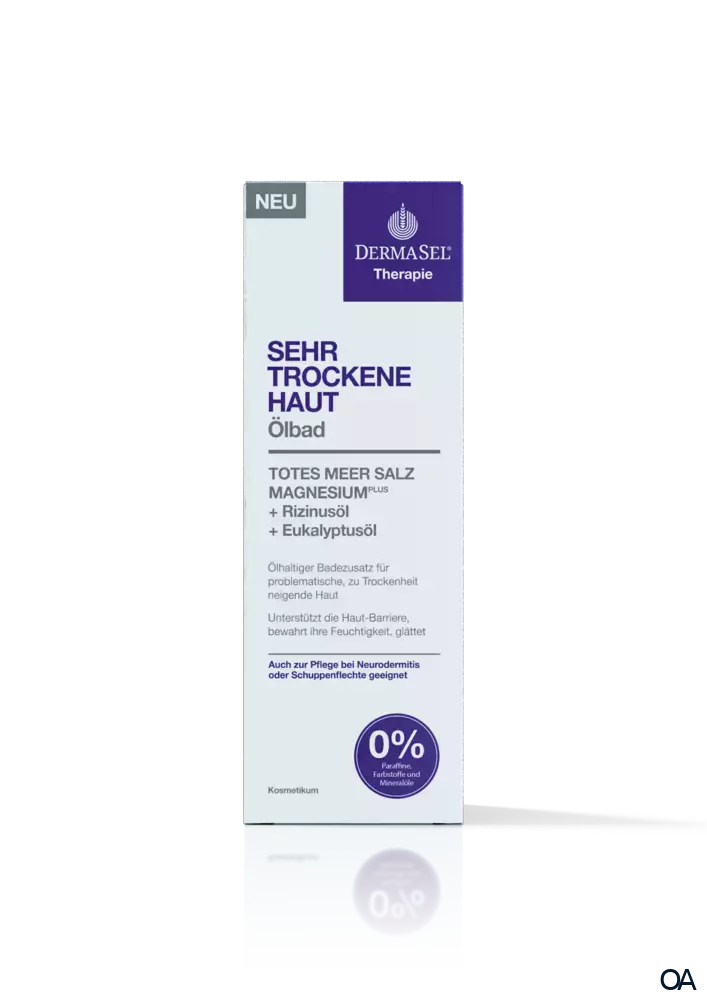 DermaSel® Therapie Ölbad Sehr Trockene Haut - Ölhaltiger Badezusatz für problematische, zu Trockenheit neigende Haut. Unterstützt die Haut-Barriere bewahrt ihre Feuchtigkeit und glättet. Auch zur Pflege bei Neurodermitis oder Schuppenflechte ...Ölhaltiger Badezusatz für problematische, zu Trockenheit neigende Haut. Unterstützt die Haut-Barriere bewahrt ihre Feuchtigkeit und glättet. Auch zur Pflege bei Neurodermitis oder Schuppenflechte geeignet.