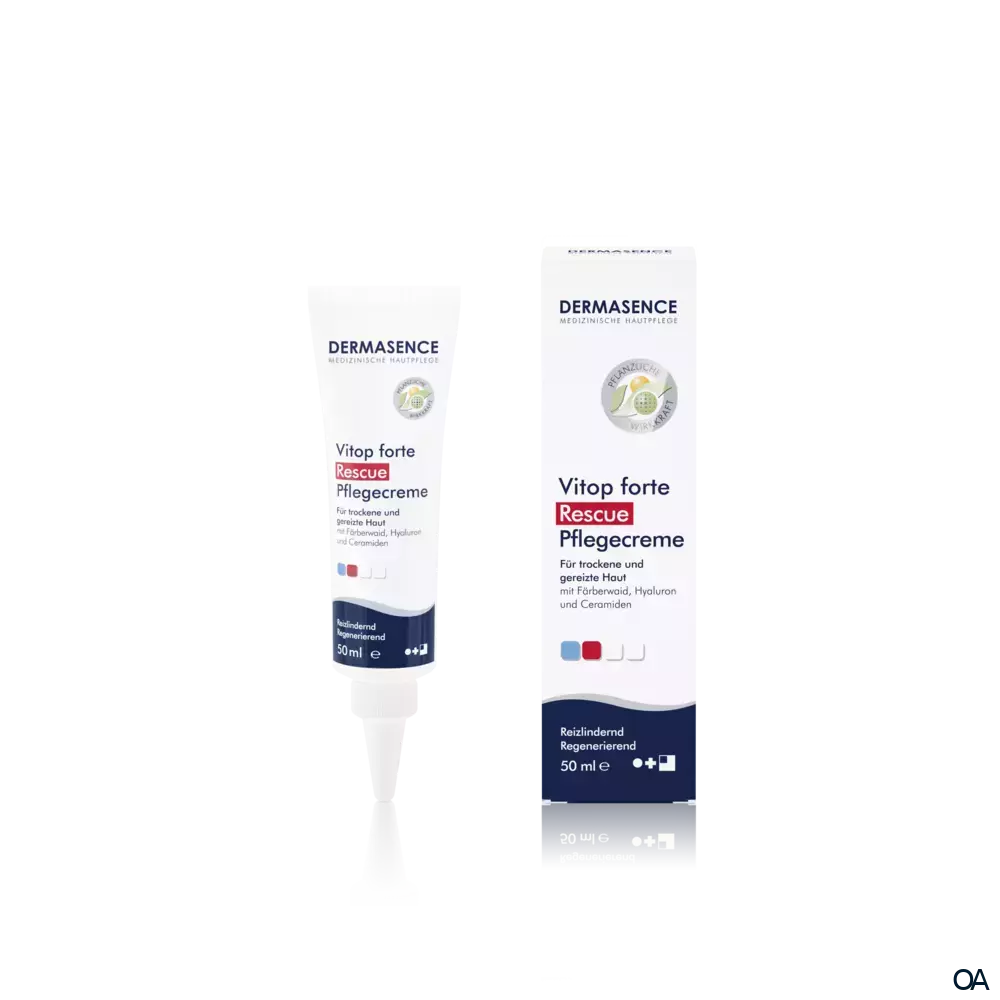 Dermasence Vitop forte Rescue Pflegecreme für trockene und gereizte Gesichtshaut mit Färberwaid, Hyaluron und Ceramiden. Beugt mit dem Vitop-Komplex und Panthenol Entzündungszeichen vor, lindert Juckreiz und Spannungsgefühle.