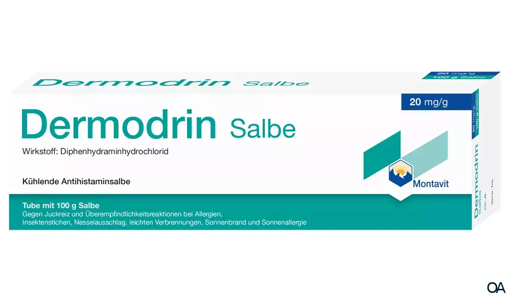 Dermodrin Salbe ist ein rezeptfreies Arzneimittel mit dem Wirkstoff Diphenhydraminhydrochlorid. Die Salbe ist ein Antihistaminikum und Antiallergikum, ein Mittel gegen Juckreiz und zur Schmerzlinderung bei Allergien und Hauterkrankungen.Dermodrin Salbe ist ein rezeptfreies Arzneimittel mit dem Wirkstoff Diphenhydraminhydrochlorid. Die Salbe ist ein Antihistaminikum und Antiallergikum, ein Mittel gegen Juckreiz und zur Schmerzlinderung bei Allergien und Hauterkrankungen.