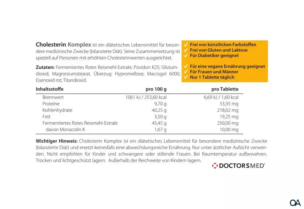 Der Cholesterin Komplex von DOCTORSMED® unterstützt erhöhte Cholesterinwerte zu senken und basiert auf natürlichen Inhaltsstoffen. Er enthält hochreinen, standardisierten Roten Reismehl-Extrakt. Der in Rotem Reismehl-Extrakt vorkommende cholesterinsenkende Stoff Monacolin K (Lovastatin) ist im Cholesterin Komplex in exakt der Konzentration pro Tablette enthalten, wie ihn die Behörde für Lebensmittelsicherheit empfiehlt. Aufgrund der guten Verträglichkeit von fermentiertem Rotem Reismehl-Extrakt ist dieser insbesondere für Personen, die Statine nicht oder nur schlecht vertragen, geeignet.