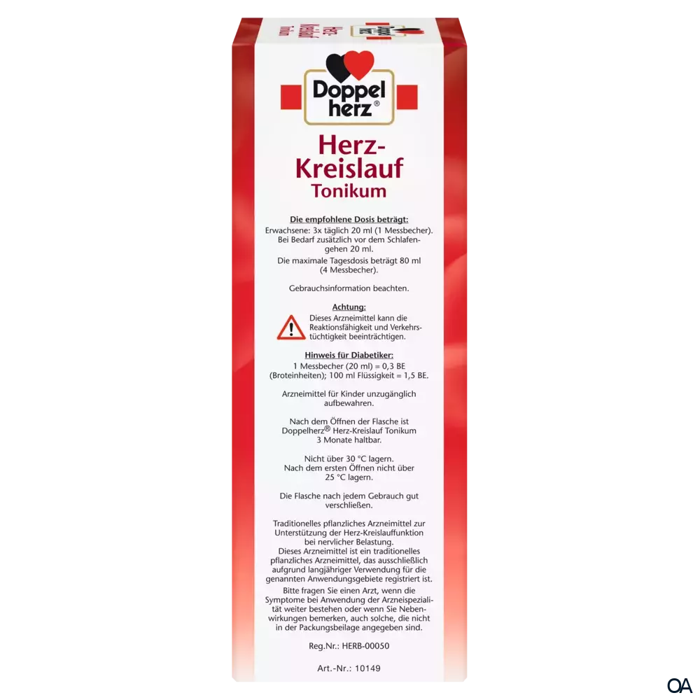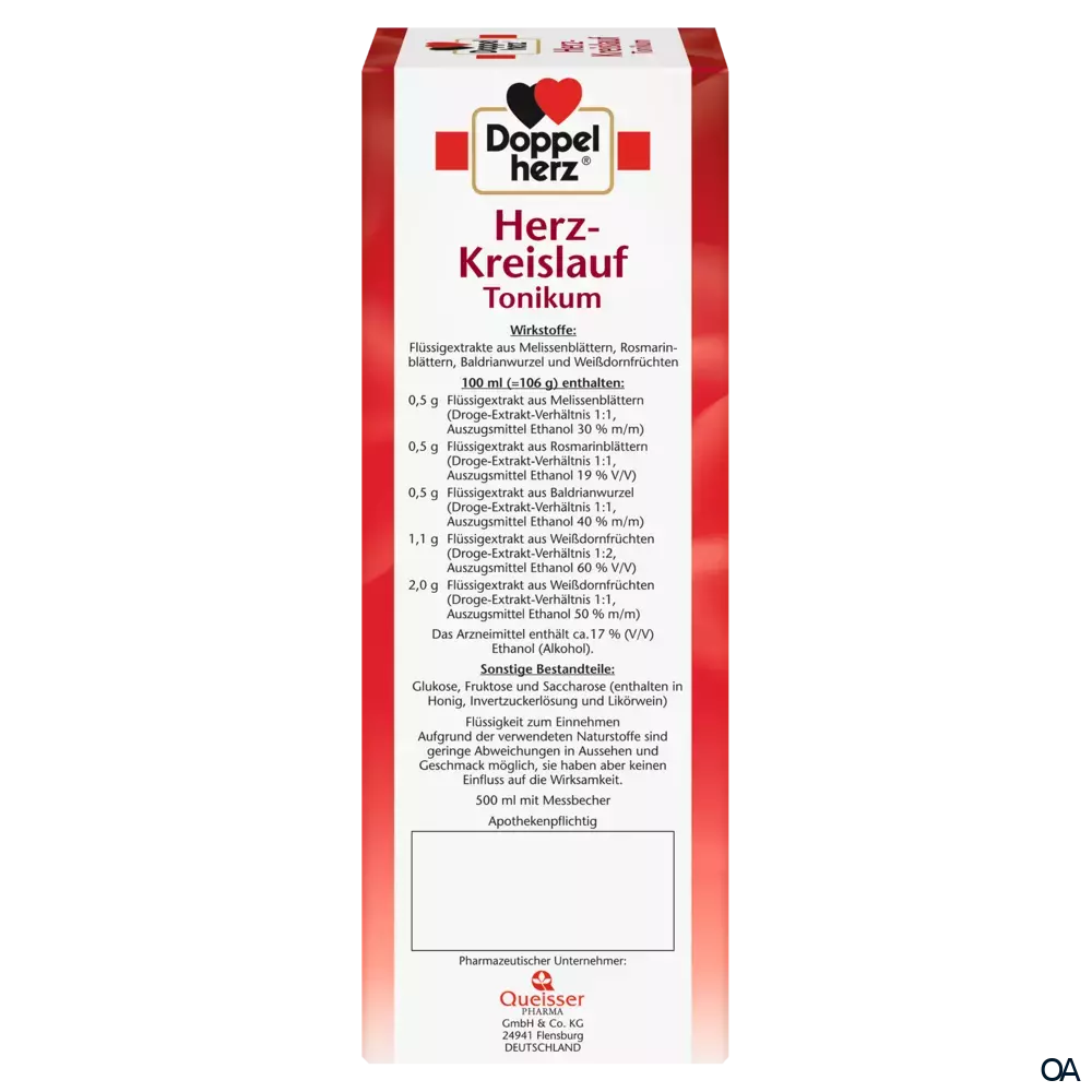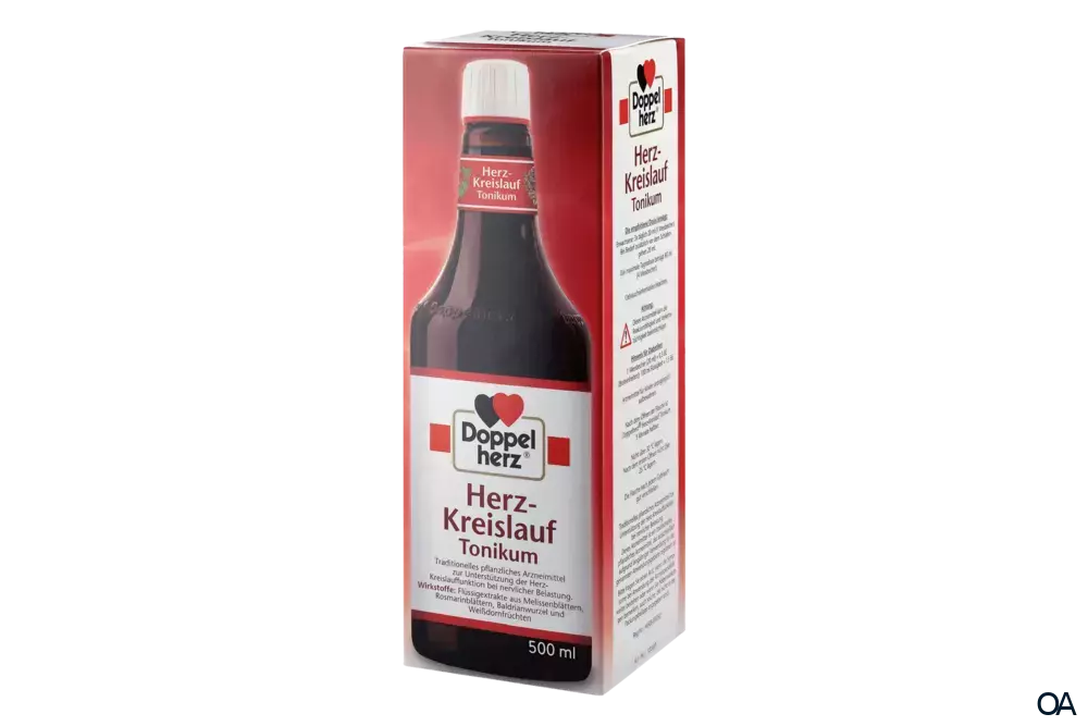 - Doppelherz Herz-Kreislauf Tonikum, Flüssigkeit zum Einnehmen. Für Erwachsene. Wirkstoffe: Flüssigextrakt aus Melissenblättern, Flüssigextrakt aus Rosmarinblättern, Flüssigextrakt aus Baldrianwurzel, Flüssigextrakt aus Weißdornfrüchten.