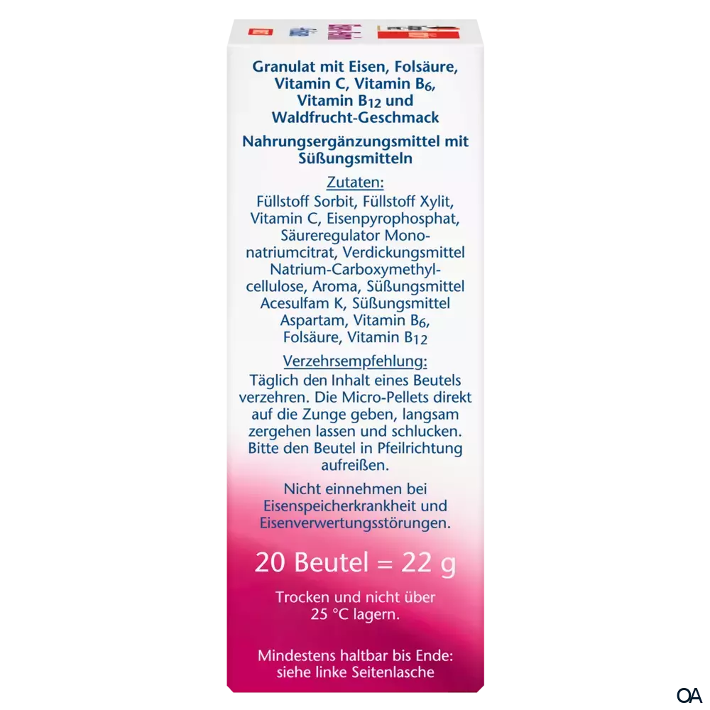 - Zusammensetzung pro Portionsbeutel % NRV*: Eisen 14 mg 100 % Folsäure 300 µg 150 % Vitamin B6 1,4 mg 100 % Vitamin B12 2,5 µg 100 % Vitamin C 80 mg 100 %. * Nährstoffbezugswerte gemäß EU-Verordnung 1169/2011. Enthält eine Phenylalaninquelle.