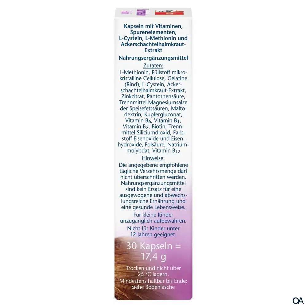 - Zutaten: L-Methionin, Füllstoff mikrokristalline Cellulose, Gelatine (Rind), L-Cystein, Ackerschachtelhalmkraut-Extrakt, Zinkcitrat, Pantothensäure, Trennmittel Magnesiumsalze der Speisefettsäuren, Maltodextrin, Kupfergluconat, Vitamin B6, Vitamin B1, Vitamin B2, Biotin, Trennmittel Siliciumdioxid, Farbstoff Eisenoxide und Eisenhydroxide, Folsäure, Natriummolybdat, Vitamin B12.