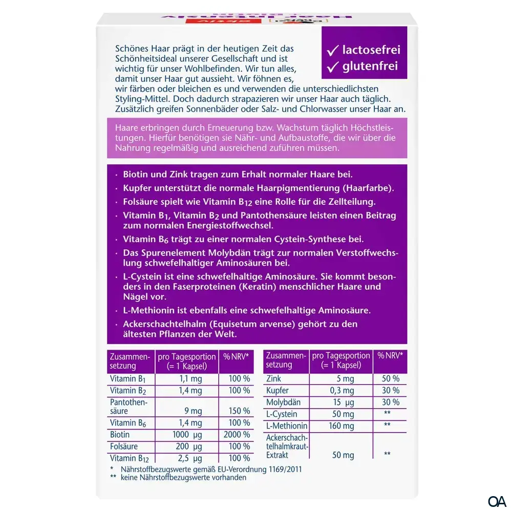 - Zusammensetzung pro Tagesdosis (1 Kapsel)%NRV*:Vitamin B1 1,1 mg 100 %, Vitamin B2 1,4 mg 100 %, Pantothensäure 9 mg 150 %, Vitamin B6 1,4 mg 100 %, Biotin 1000 μg 2000%, Folsäure 200 μg 100 %, Vitamin B12 2,5 μg 100 %, Zink 5 mg 50 %, Kupfer 0,3 mg 30 %, Molybdän 15 μg 30 %, L-Cystein 50 mg **, L-Methionin 160 mg **, Ackerschachtelhalmkraut-Extrakt 50 mg **. * Nährstoffbezugswerte gemäß EU-Verordnung 1169/2011. ** keine Nährstoffbezugswerte vorhanden.