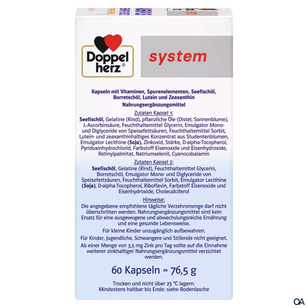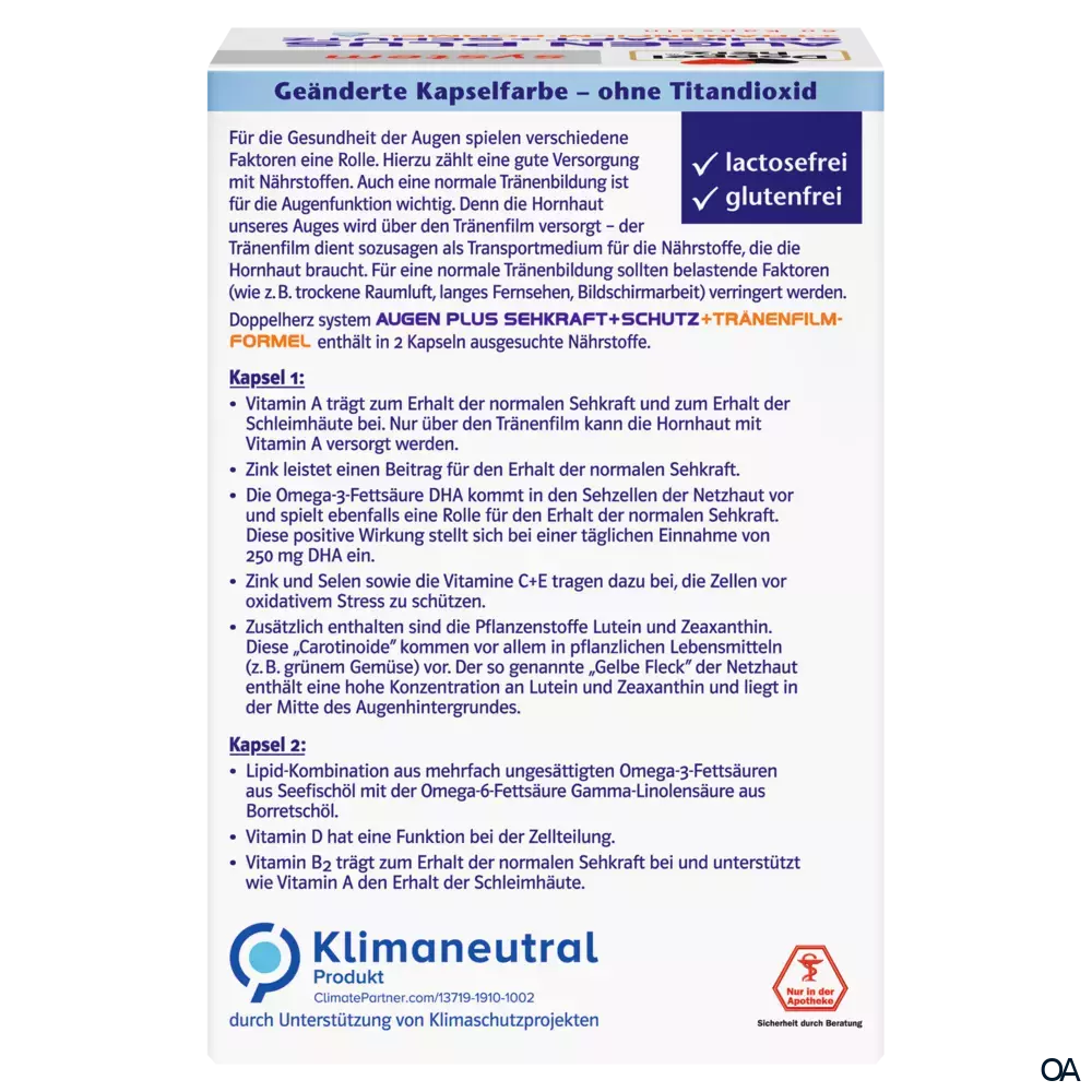 Doppelherz system AUGEN PLUS SEHKRAFT + SCHUTZ + TRÄNENFILM-FORMEL enthält in zwei Kapseln: