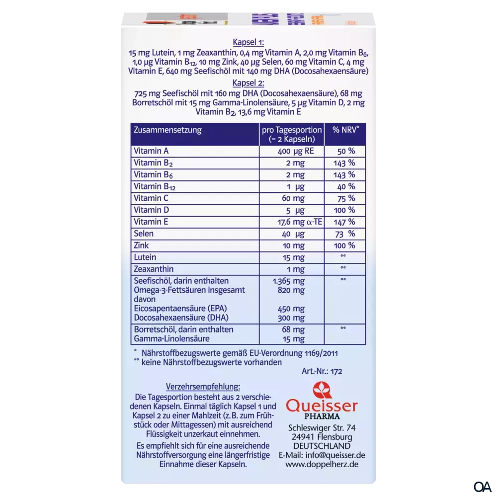 - Zusammensetzung pro 2 Kapseln % NRV*: Vitamin A 400 µg RE 50 %, Vitamin B2 2 mg 143 %, Vitamin B6 2 mg 143 %, Vitamin B12 1 µg 40 %, Vitamin C 60 mg 75 %, Vitamin D 5 µg 100 %, Vitamin E 17,6 mg α-TE 147 %, Selen 40 µg 73 %, Zink 10 mg 100 %, Lutein 15 mg **, Zeaxanthin 1 mg **, Omega-3-Fettsäuren 820 mg **, Eicosapentaensäure (EPA) 450 mg **, Docosahexaensäure (DHA) 300 mg **, Gamma-Linolensäure 15 mg **. * Nährstoffbezugswerte gemäß EU-Verordnung 1169/2011. ** Keine Nährstoffbezugswerte vorhanden.