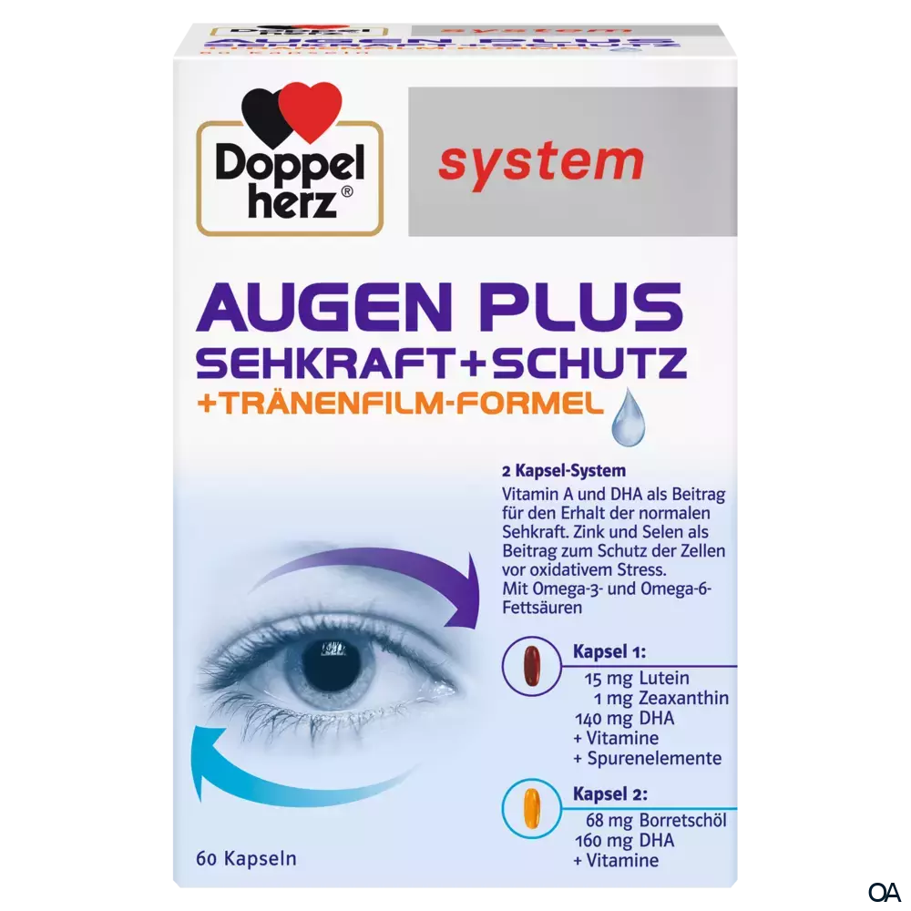Doppelherz system AUGEN PLUS SEHKRAFT + SCHUTZ + Tränenfilm-Formel Kapseln - 2 Kapsel-System. Vitamin A und DHA für die Sehkraft. Zink, Selen, Vitamin C+E für den Zellschutz. Mehrfach ungesättigte Omega-3- und Omega-6-Fettsäuren.