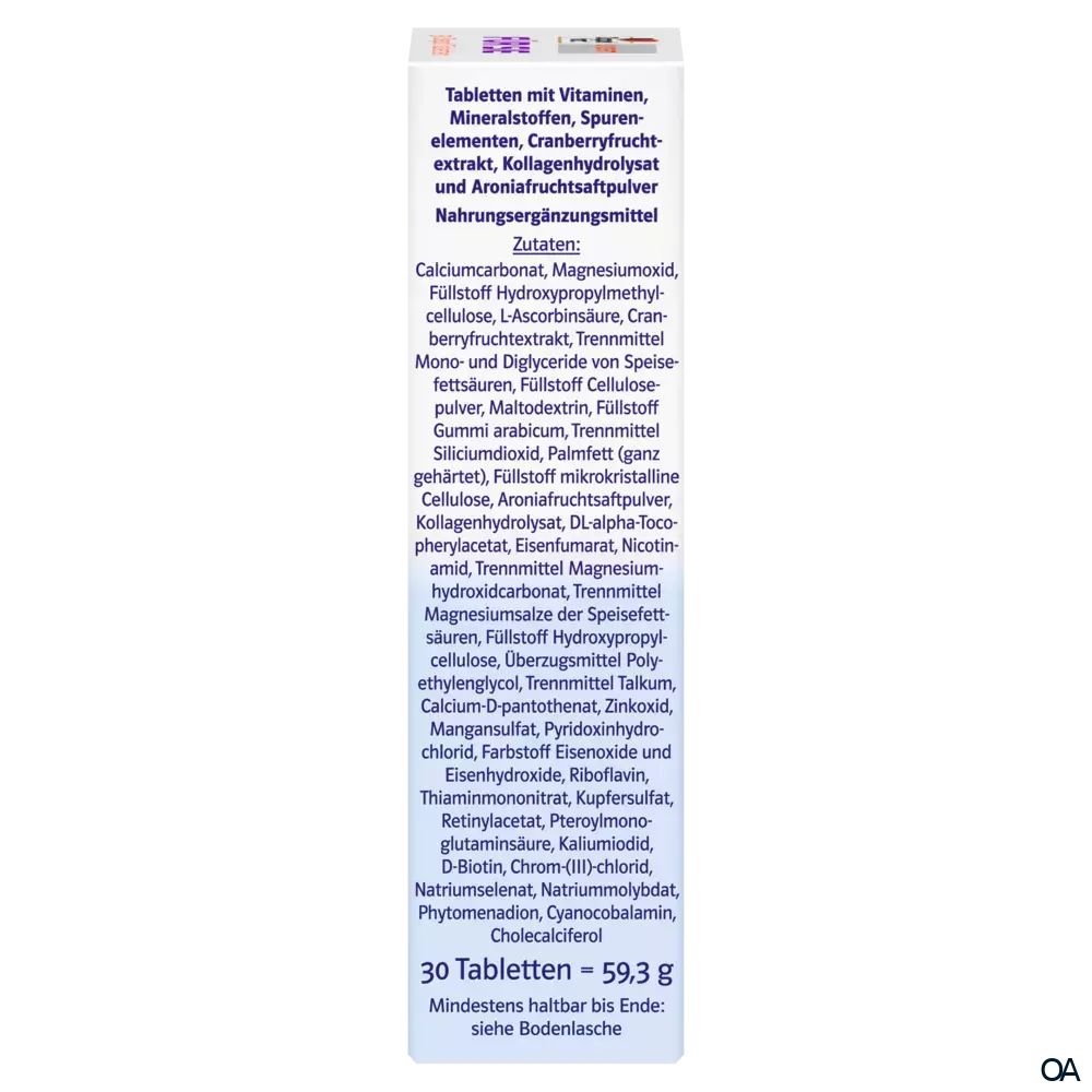 - Zusammensetzung pro Tablette % NRV*: Vitamin A 400 µg RE 50 %, Vitamin E 16 mg α-TE 133 %, Vitamin C 120 mg 150 %, Vitamin K 24,5 µg 33 %, Vitamin B1 1,43 mg 130 %, Vitamin B2 1,82 mg 130 %, Vitamin B6 1,82 mg 130 %, Vitamin B12 6 µg 240 %, Vitamin D 5 µg 100 %, Biotin 100 µg 200 %, Folsäure 300 µg 150 %, Niacin 16 mg NE 100 %, Pantothensäure 6 mg 100 %, Calcium 320 mg 40 %, Magnesium 100 mg 27 %, Eisen 7,5 mg 54 %, Jod 100 µg 67 %, Kupfer 0,5 mg 50 %, Mangan 1 mg 50 %, Molybdän 25 µg 50 %, Chrom 20 µg 50 %, Selen 27,5 µg 50 %, Zink 5 mg 50 %, Cranberryextrakt 100 mg **, Kollagenhydrolysat 30 mg **, Aroniasaftpulver 30 mg **. * Nährstoffbezugswerte gemäß EU-Verordnung 1169/2011. ** Keine Nährstoffbezugswerte vorhanden.