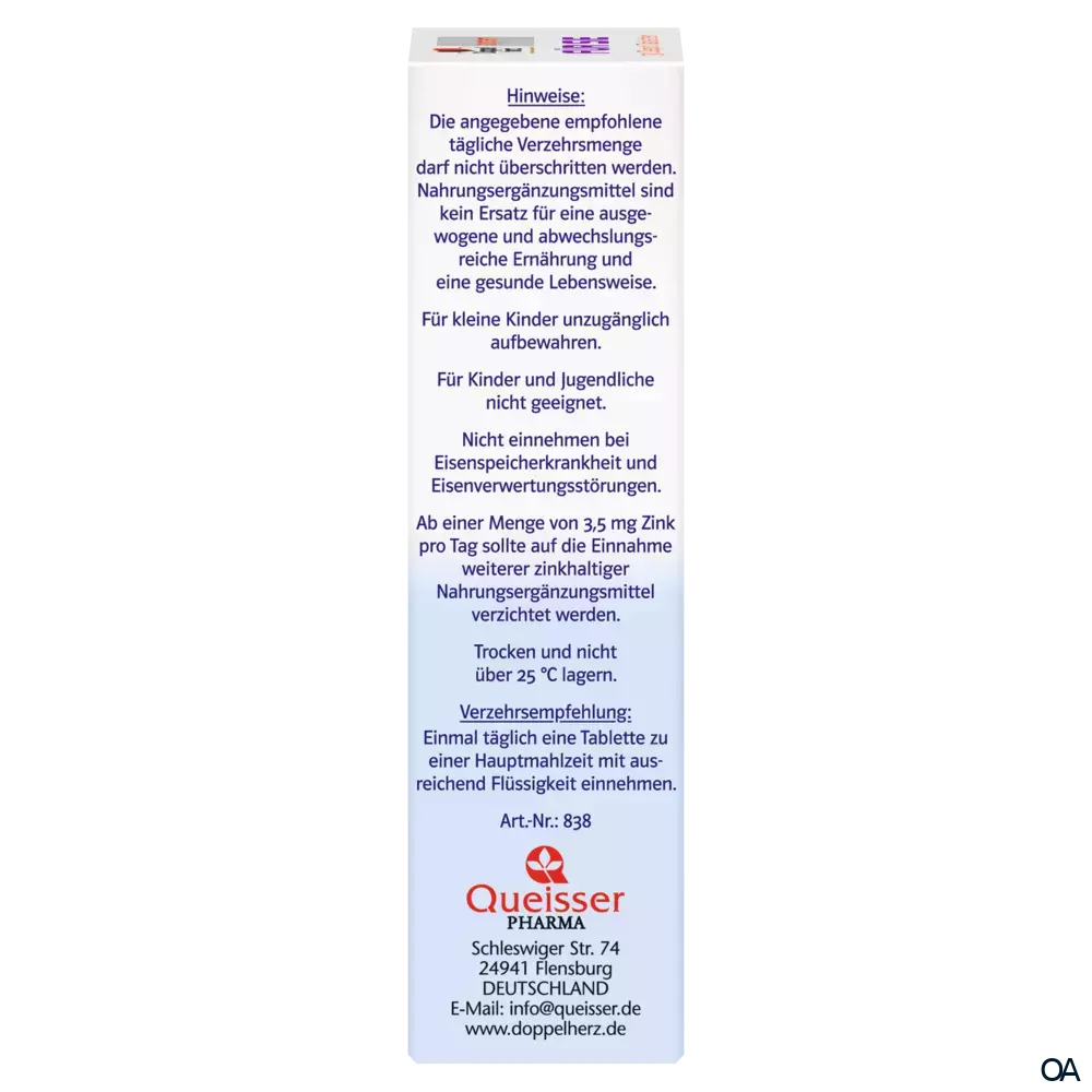 - Hinweise: Für Kinder und Jugendliche nicht geeignet. Nicht einnehmen bei Eisenspeicherkrankheit und Eisenverwertungsstörungen. Ab einer Menge von 3,5 mg Zink pro Tag sollte auf die Einnahme weiterer zinkhaltiger Nahrungsergänzungsmittel verzichtet werden.