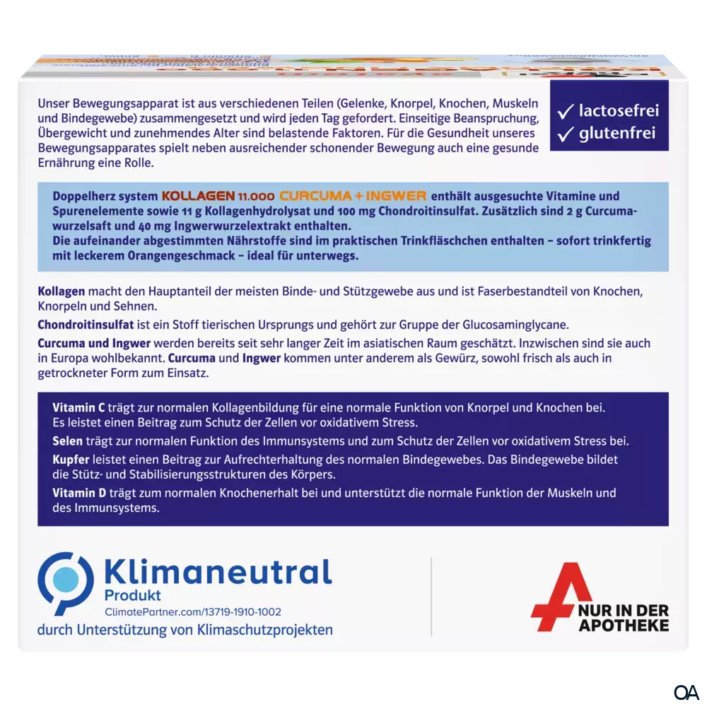 - Zusammensetzung pro Trinkfläschchen % NRV*: Kollagenhydrolysat 11 g **, Chondroitinsulfat 100 mg **, Vitamin C 60 mg 75 %, Vitamin D 5 µg 100 %, Kupfer 0,3 mg 30 %, Selen 16,5 µg 30 %, Curcumawurzelsaft 2 g **, Ingwerwurzelextrakt 40 mg **. * Nährstoffbezugswerte gemäß EU-Verordnung 1169/2011. ** Keine Nährstoffbezugswerte vorhanden.